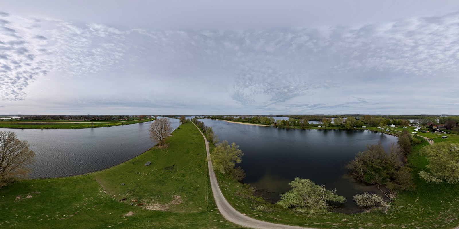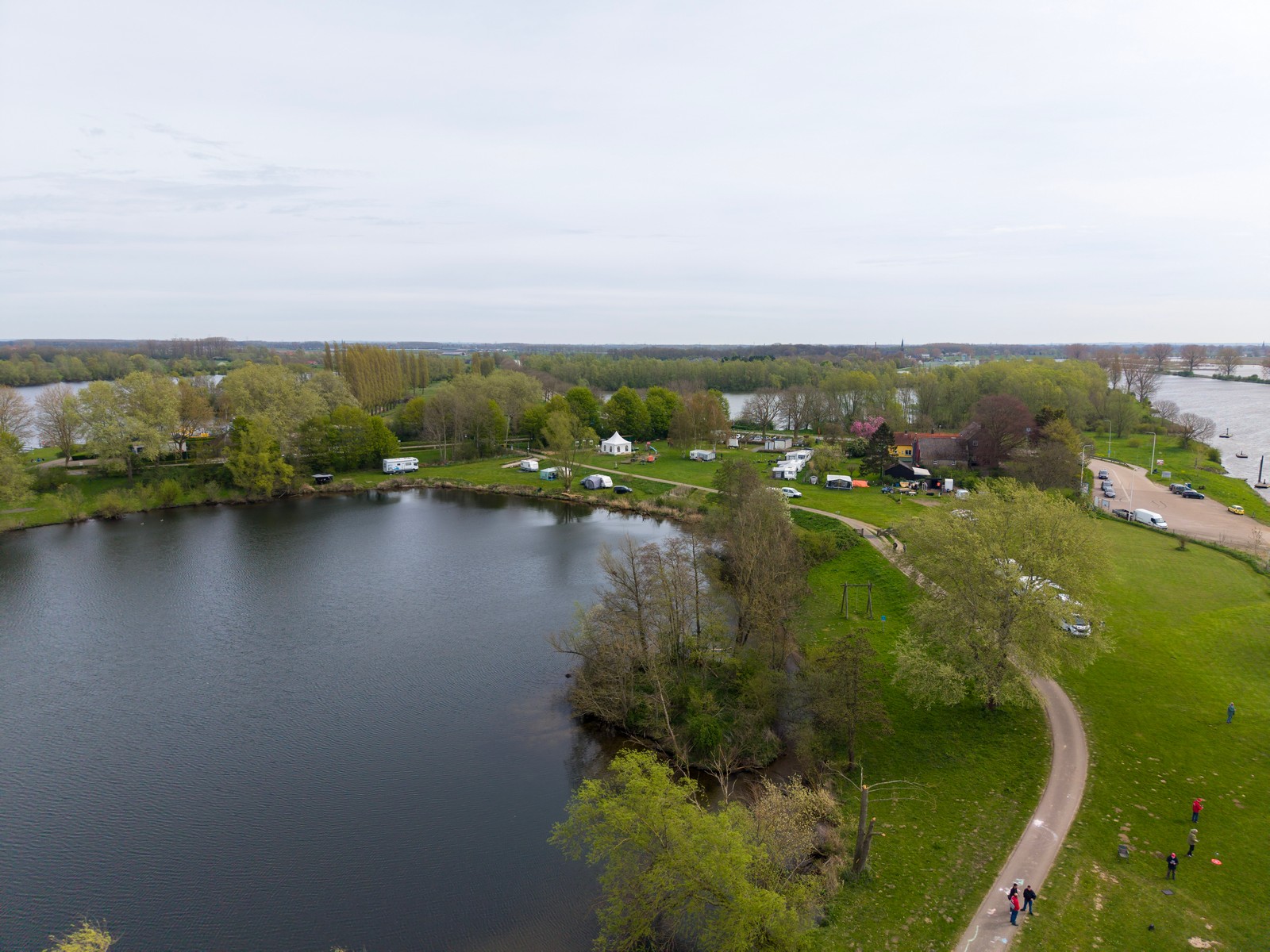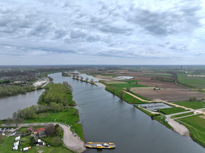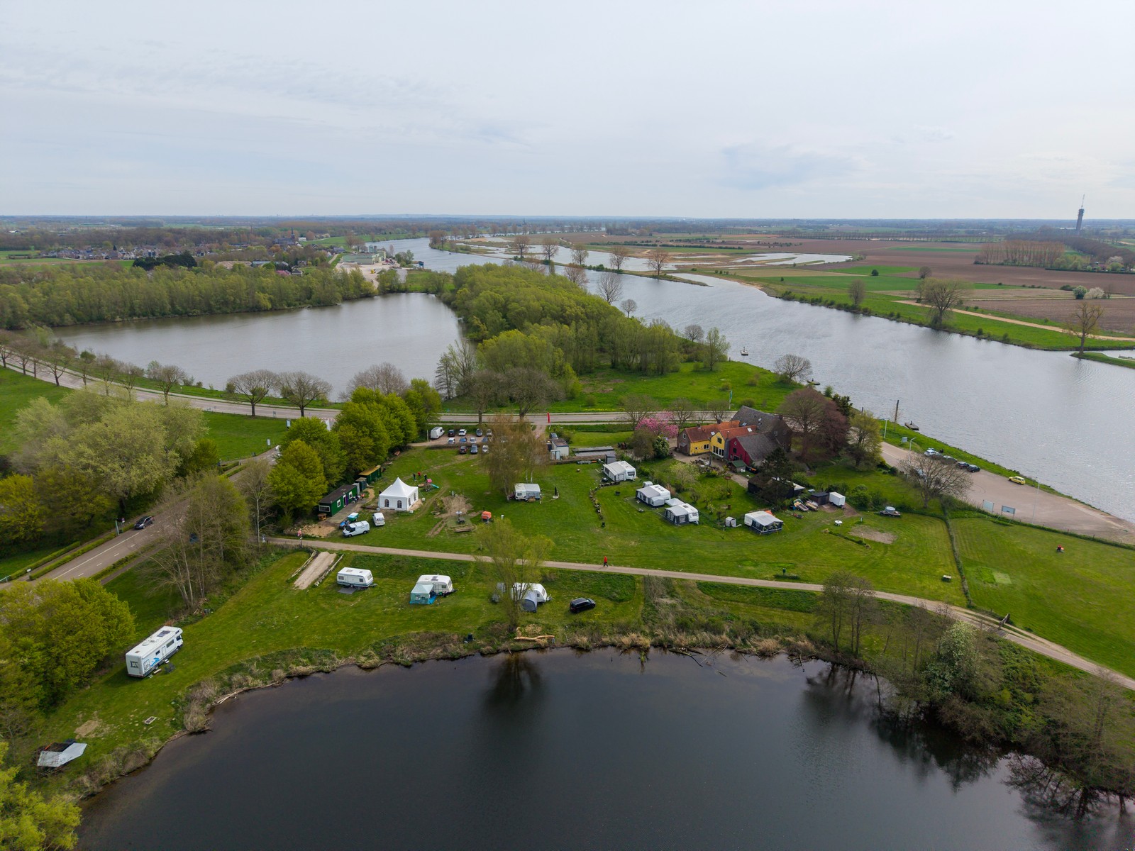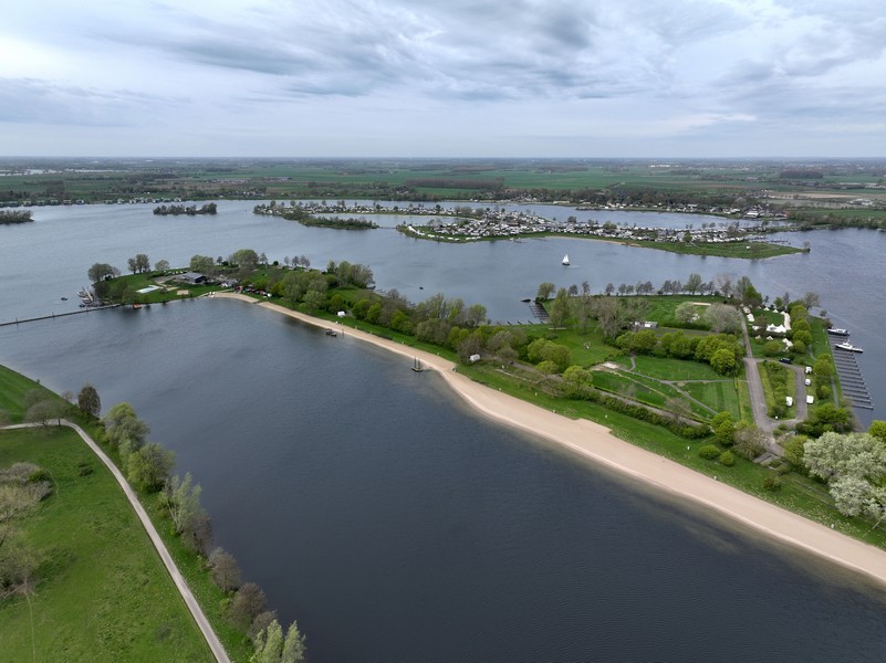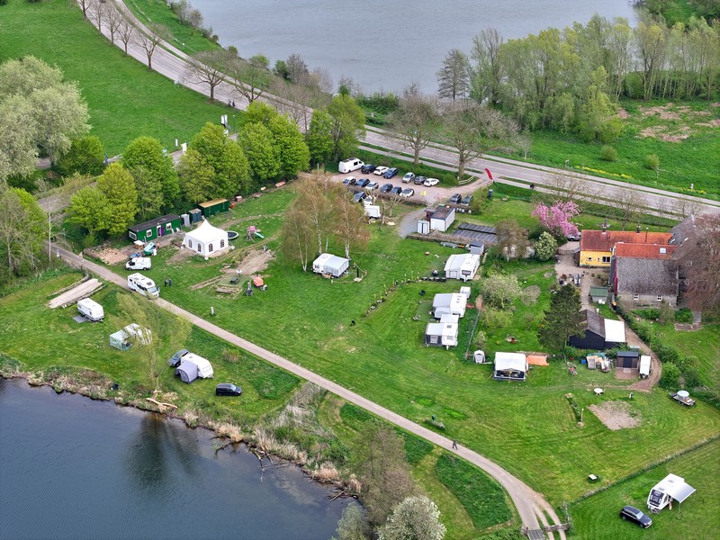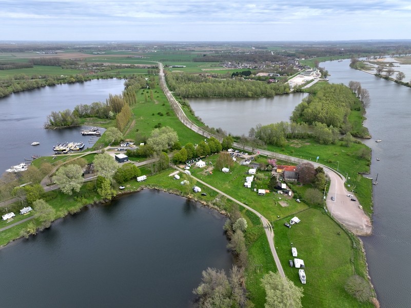 Luchtfoto van een groen rivierenlandschap bij Appeltern, met meerdere waterplassen, een dijkweg en een kleine camping met caravans en campers langs het water. Op de achtergrond zijn uitgestrekte landbouwvelden en een dorp zichtbaar onder een bewolkte lucht.