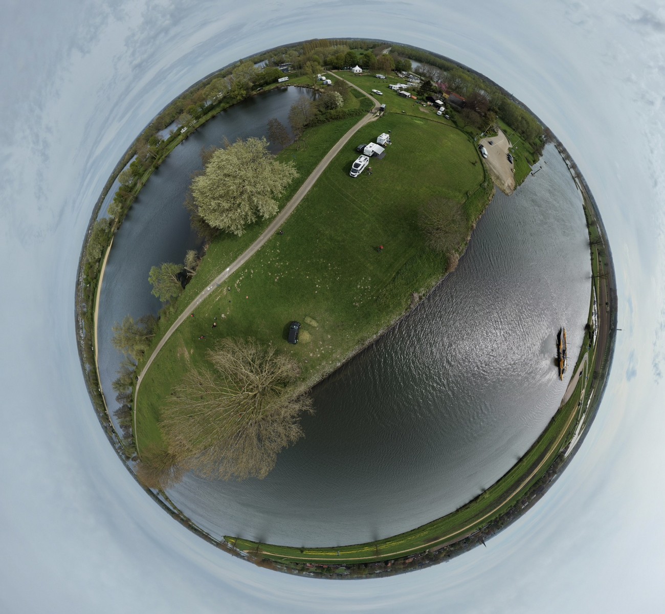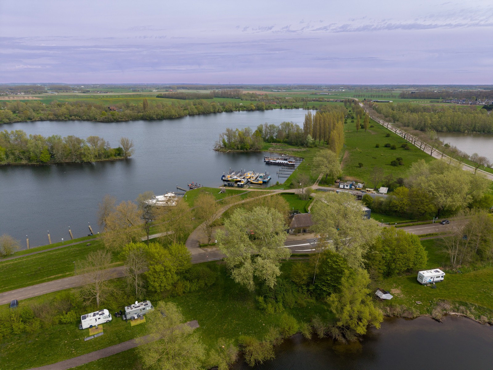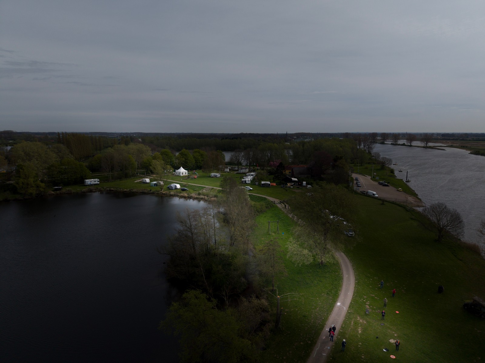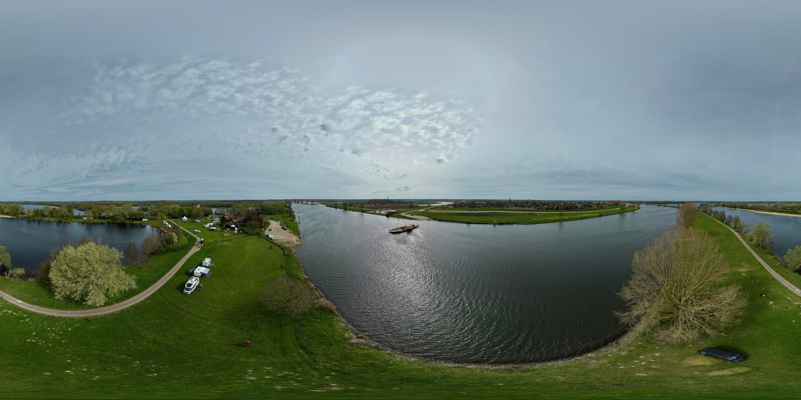 Luchtfoto van een groen rivierenlandschap bij Appeltern, met meerdere waterplassen, een dijkweg en een kleine camping met caravans en campers langs het water. Op de achtergrond zijn uitgestrekte landbouwvelden en een dorp zichtbaar onder een bewolkte lucht.