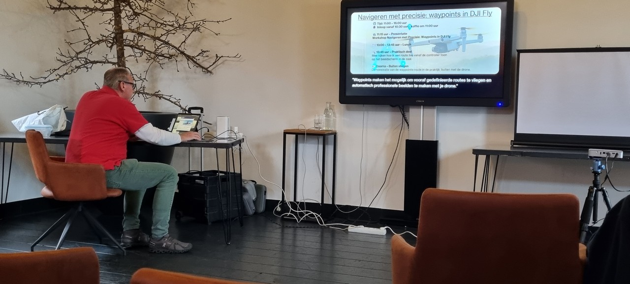 Na het theoretische gedeelte werd binnen gedemonstreerd hoe een waypoint-missie wordt aangemaakt. Hierbij werd gebruikgemaakt van een speciale adapter, de Drone Valley RC-2 Video Display Kit, waarmee het scherm van de DJI RC 2 Smart Controller via een HDMI-kabel op het grote scherm kon worden getoond. Dit maakte de stappen en instellingen in DJI Fly voor alle deelnemers goed zichtbaar.