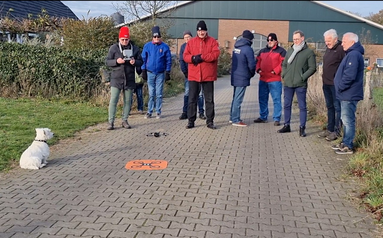 Het was buiten behoorlijk koud, waardoor het praktische deel in een snel tempo werd uitgevoerd. Ondanks de omstandigheden konden alle deelnemers goed meekijken terwijl de drone de ingestelde waypoint-missie uitvoerde.