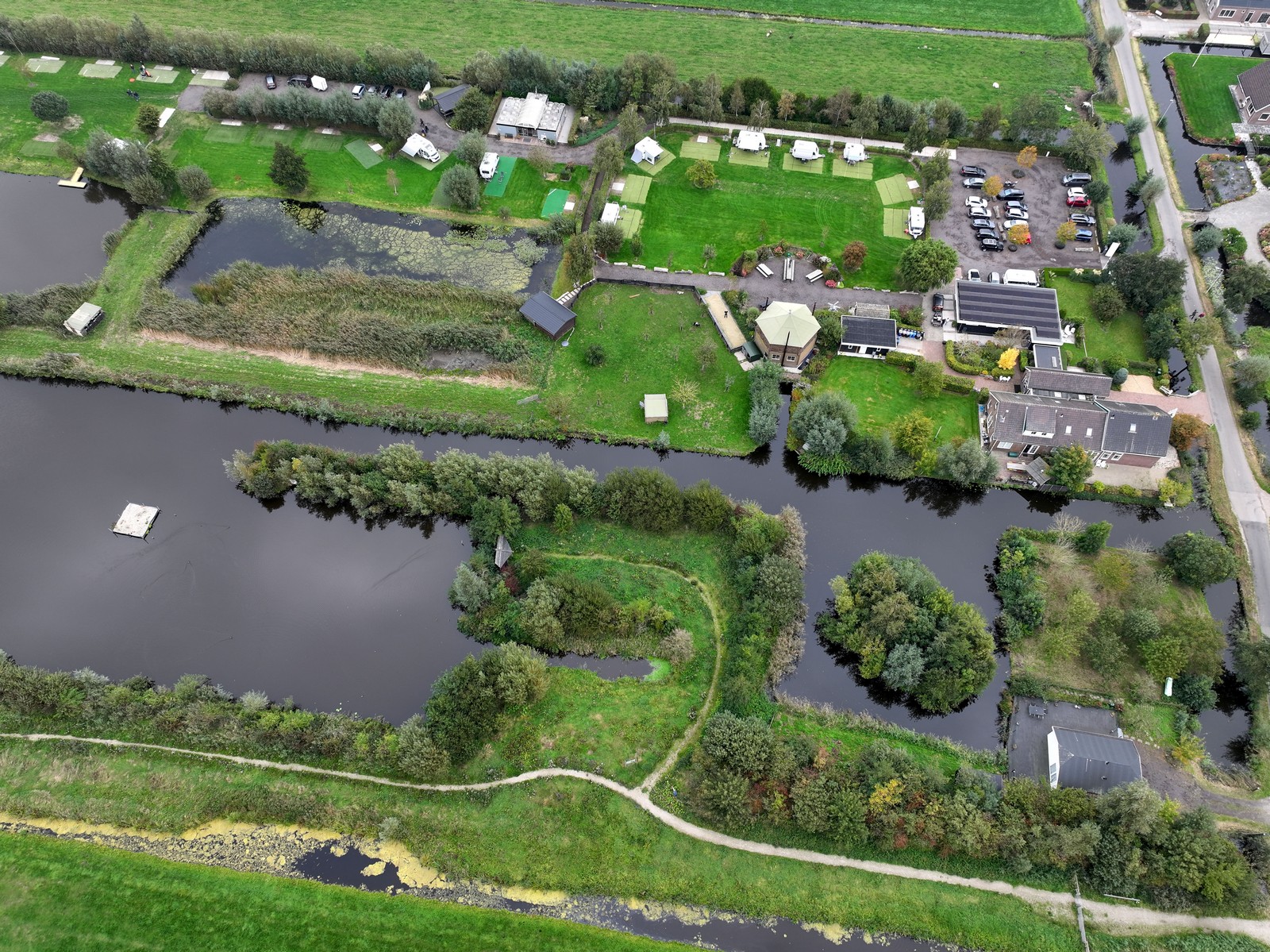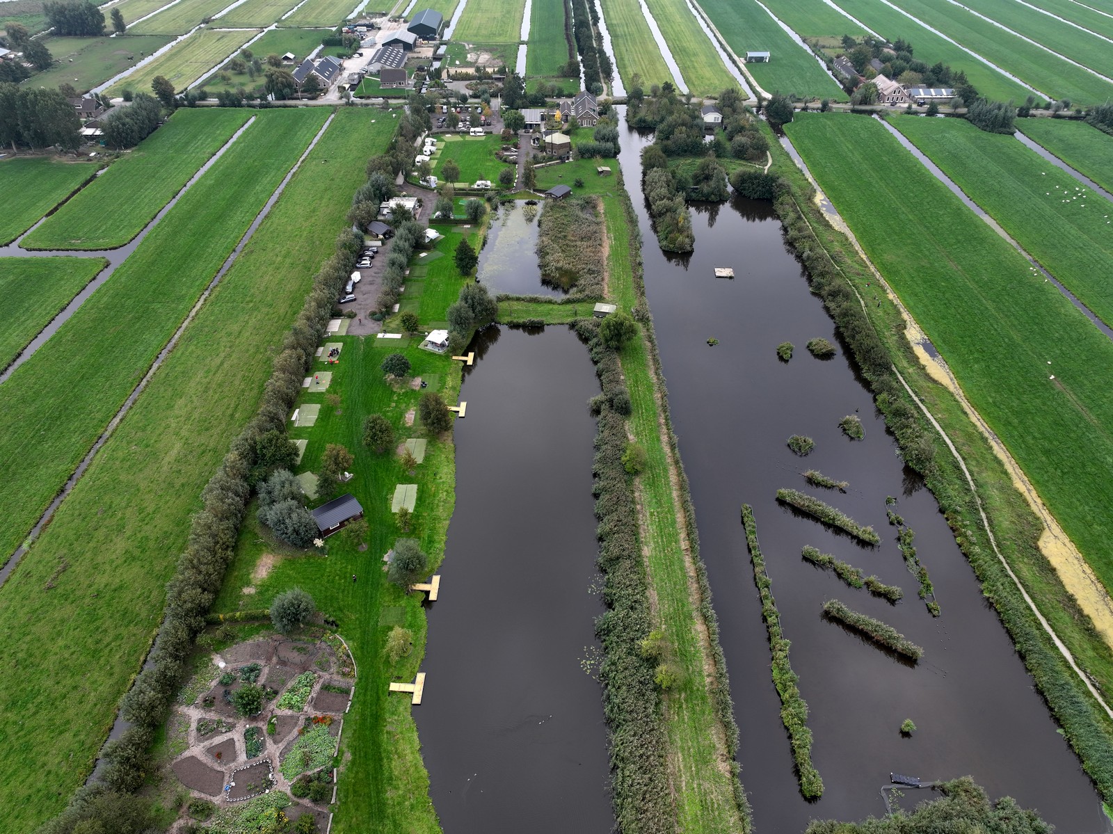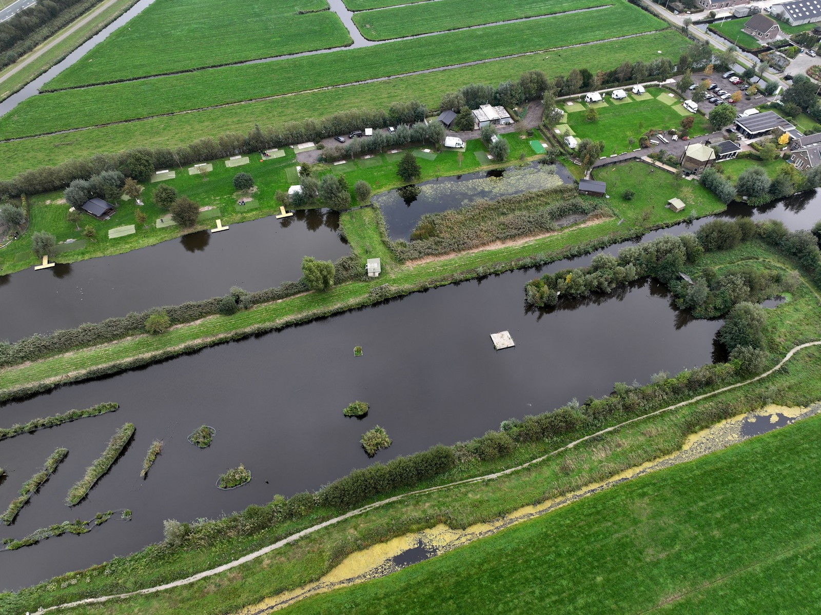 Vorig jaar konden we nog terecht op het veld tegenover de hooischuur, maar dat stond nu vol met kampeerders. Geen probleem: de achterste velden waren vrij en boden zelfs meer ruimte. Ook op het IJsvogelpad naast de camping kon gevlogen worden, een prachtige plek tussen een mini-natuurgebied en de weilanden. Kortom: plek genoeg om los te gaan met de drones.